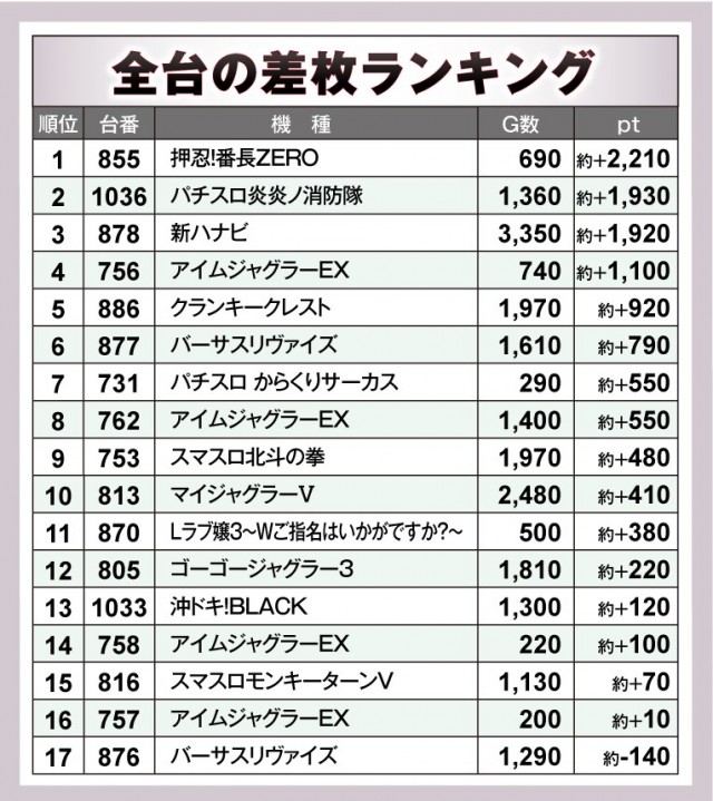 2千pt越えの『押忍!番長ZERO』を筆頭に活躍する台を多数確認。