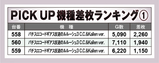 全8機種が活躍した1日だが、その中で『パチスロコードギアス反逆のルルーシュ3 C.C.&Kallen ver.』『沖ドキ!BLACK』『シャア専用パチスロ 逆襲の赤い彗星』『スマスロ交響詩篇エウレカセブン4 HI-EVOLUTION』『パチスロ からくりサーカス』は全台がプラス差枚数を達成。ほかの機種も大きなマイナスが見られず、やはり大きな手応えを感じられるエリアだった。同店の実力が窺える内容で、ファンは満足度の高い1日を過ごしたはずだ。