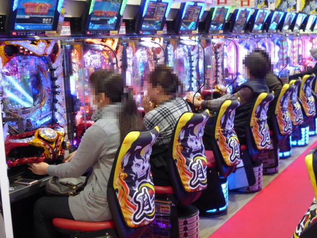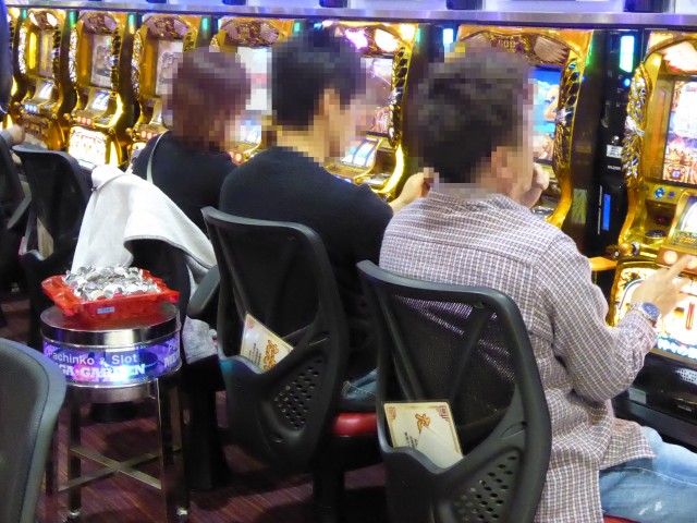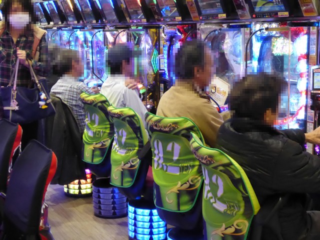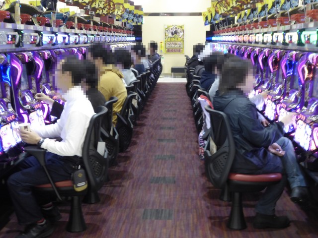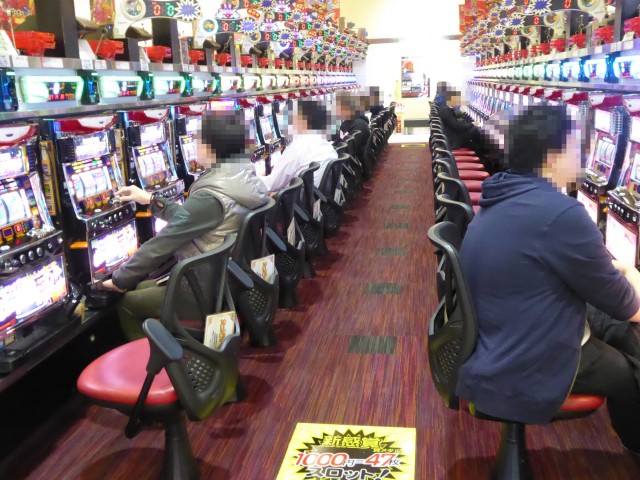ジャグラーシリーズのなかでも特徴的な光り方が人気の「ファンキージャグラー」では世代を問わずプレイヤーが駆けつけており、その魅力的な光を見るために真剣な眼差しで台と向き合っていた。