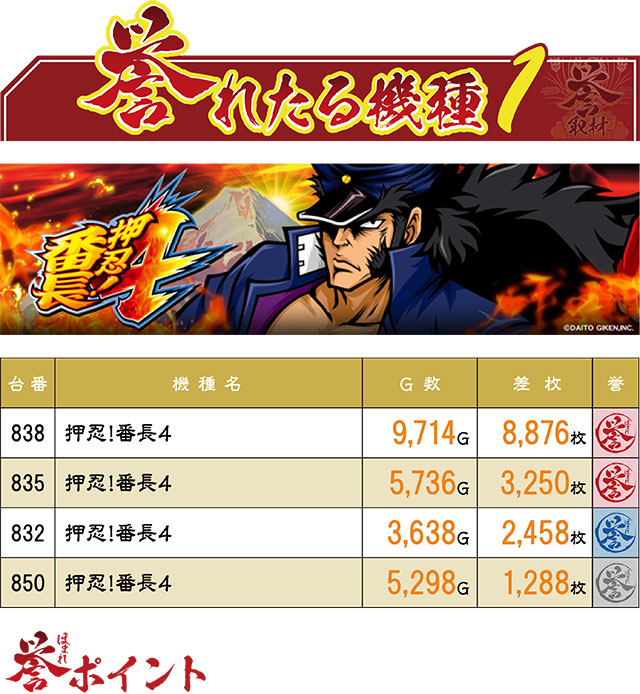 8台設置の『押忍!番長4』は、半数の4台に誉マークが。この日の最高差枚となった838番台を筆頭に、プラスとなった台はいずれも優秀台っぽい挙動を見せていたようだ。この結果から察するに、最低でもニブイチはあった…!?