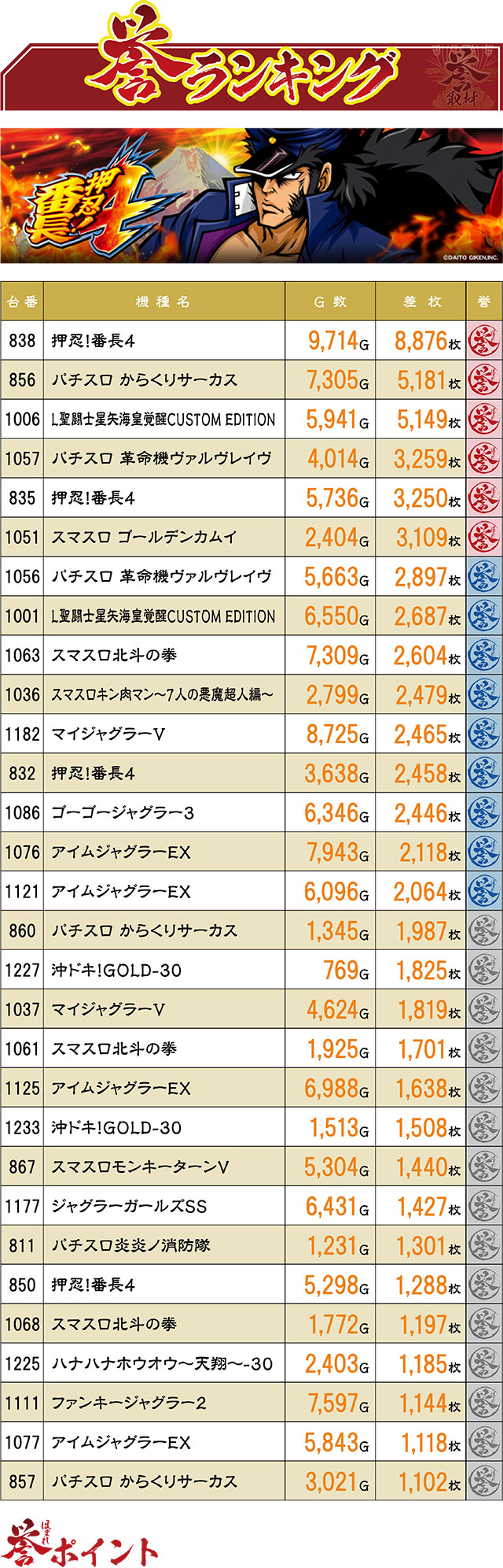 この日の首位レコードは、+9,000枚近い差枚を叩き出した『押忍!番長4』。優秀台挙動まる出しで記録にも記憶にも残る結果を披露してくれた。TOP30の結果を見る限りでは、今回も沖スロと『ジャグラー』シリーズが数多くランクインしており、常連ユーザーの願望を叶えた優秀台事情だった模様。