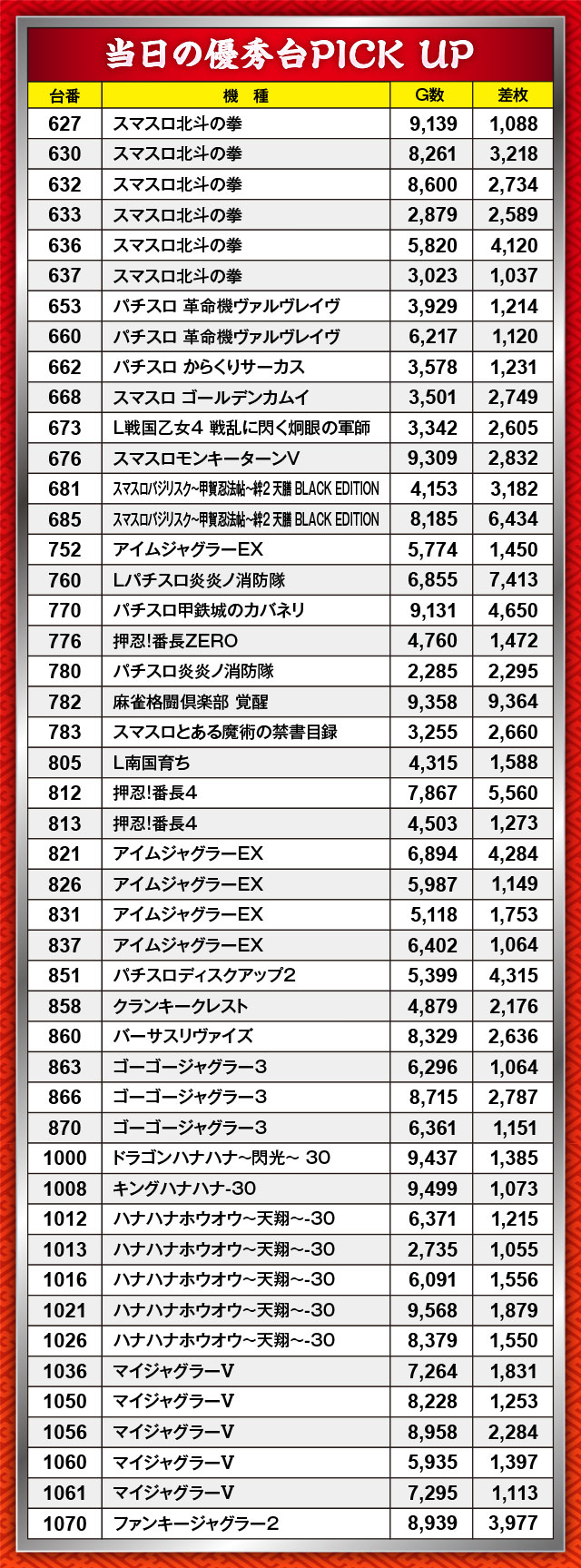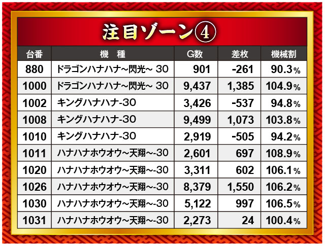 今回も『ハナハナ』コーナーから多くのプラス台を確認。特大レコードがなかった代わりに、大マイナスの台もナシ。どの台も安定してチカっていた印象だ。