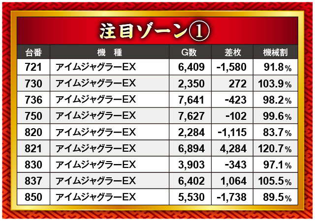 計40台設置の『アイムジャグラーEX』コーナーからは、軽快な大当りサウンドが絶え間なく響き渡っていた。優秀台挙動を見せた台はしっかりプラス差枚を実現しており、中でも821番台は+4,000枚を上回る好結果!