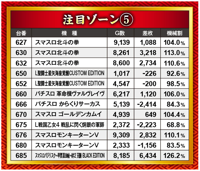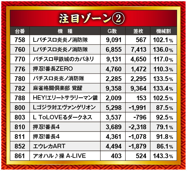 優秀台挙動を見せながらも、プラスになった台とマイナスに陥ってしまった台の二極化が見て取れたこちらのブロック。しっかり反応した台は7,000枚超えや9,000枚超えなどの大記録を残すこととなった。この日の首位レコードに輝いた『麻雀格闘倶楽部 覚醒』782番台の機械割は、驚異の133.4%をマーク!