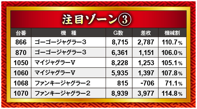 その他の『ジャグラー』コーナーからもプラス台が飛び出した。どの『ジャグ』からも合算確率の良好な台が出現していた上、『ファンキージャグラー2』1070番台のように機械割110%オーバーを達成した台も…!