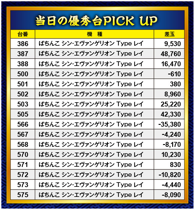 前回に続き、今回も『ぱちんこ シン・エヴァンゲリオン Type レイ』コーナーの動向に注目。盛り上がっていたのはこれまでと同じだが、トータル勝率が前回よりも上昇!さらに今回は+40,000玉超えレコードが2台も誕生することとなった。