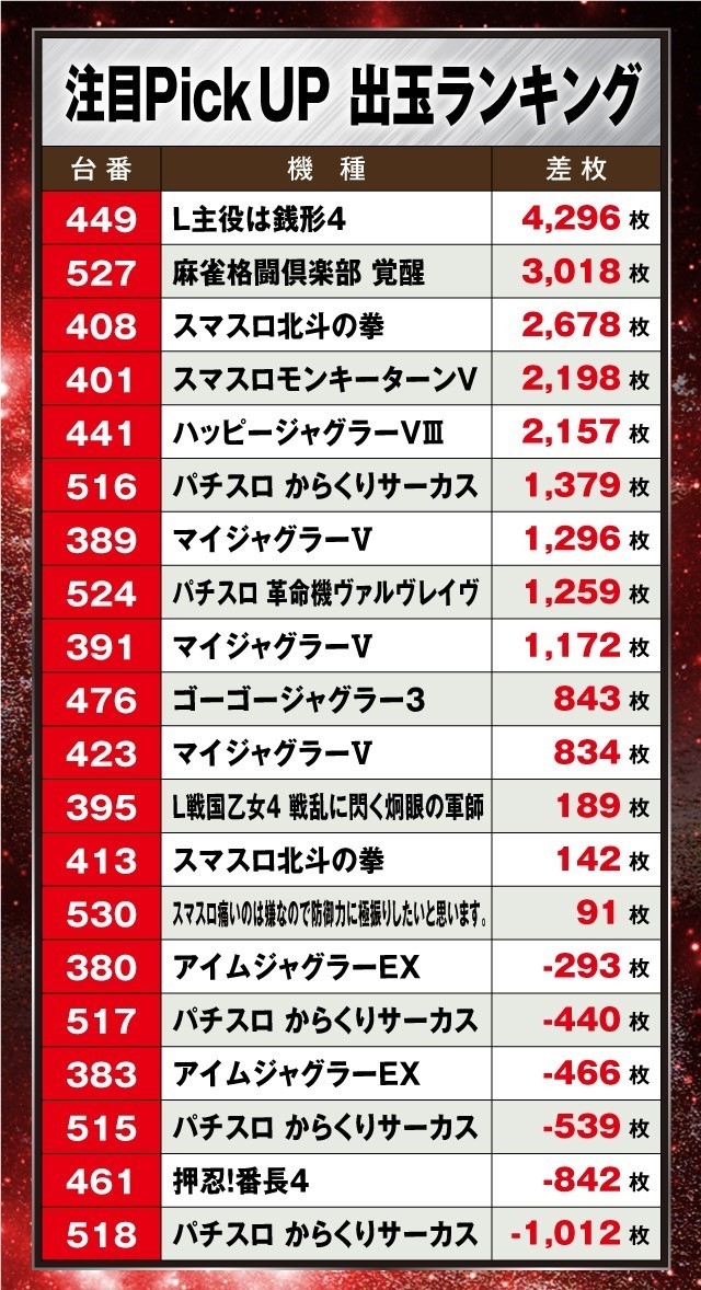 一方、ジャグラーシリーズでは『ハッピージャグラーVⅢ』の+2,157枚をはじめ、『マイジャグラーⅤ』で+1,000枚超が2台も出現、惜しくもプラスに届かなかった台もあるが、そのマイナスは全て500枚以下という安定感でファンを楽しませていた。