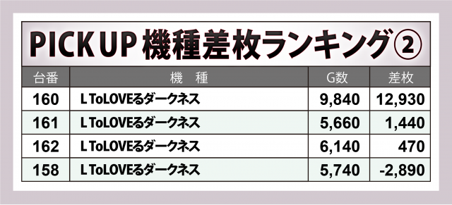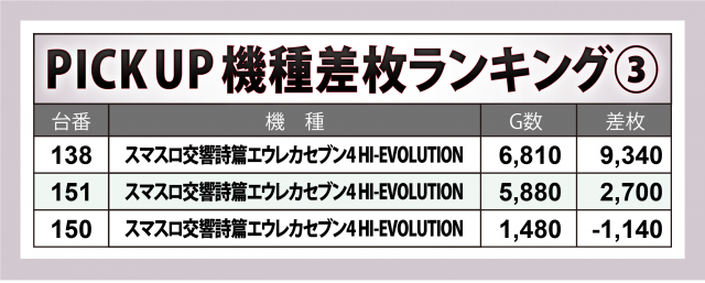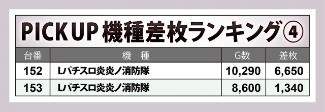 また、『L ToLOVEるダークネス』も+13,000枚弱で万枚オーバーをマーク、『スマスロ交響詩篇エウレカセブン4 HI-EVOLUTION』には+9,300枚超、『Lパチスロ炎炎ノ消防隊』には+6,700枚弱と、それぞれに突出した出玉の台が秘められていた。