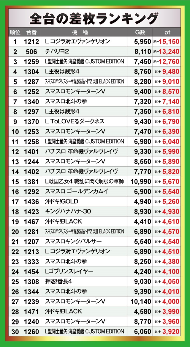 各店の全台差枚ランキング