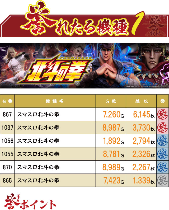 パチスロ差枚の第2位に躍り出た867番台を筆頭に、誉マークが6台も出現。『スマスロ北斗の拳』が18台設置なので、1/3が誉レコードだったことになる。当然、優秀台も多かったと推測。