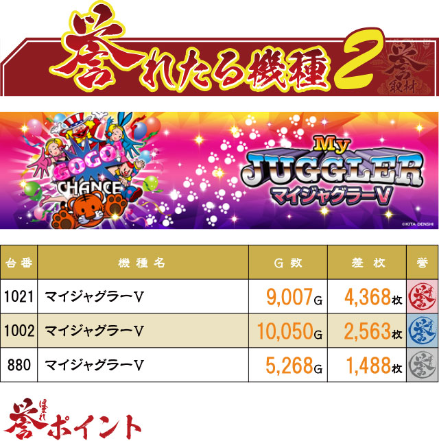 『マイジャグラーⅤ』では、1021番台がAT機も顔負けの+4,000枚オーバーを達成。青誉マークだった1002番台と同じく、コンスタントにGOGOランプを灯す勢いに、打っていた方も優秀台を確信したことだろう。