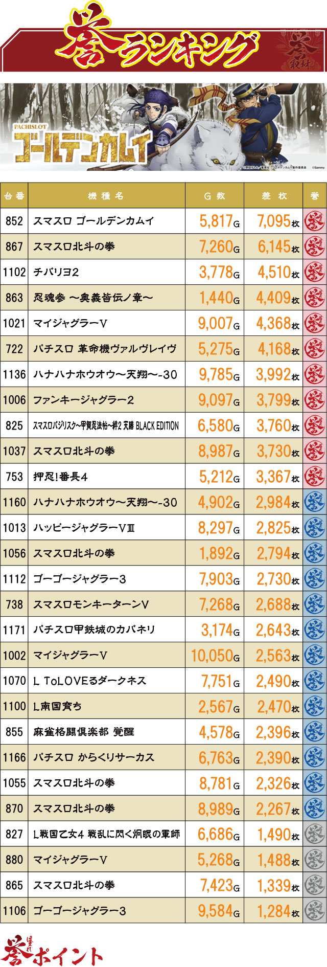 この日のパチスロコーナーにおける最高差枚記録は、『スマスロ ゴールデンカムイ』によって生み出された+7,095枚。この台の挙動からも優秀台だったのは間違いないだろう。また、『チバリヨ2』『マイジャグラーⅤ』『ハナハナホウオウ~天翔~-30』などの完全告知マシンが上位にランクインしていたのも見逃せないポイントだ。