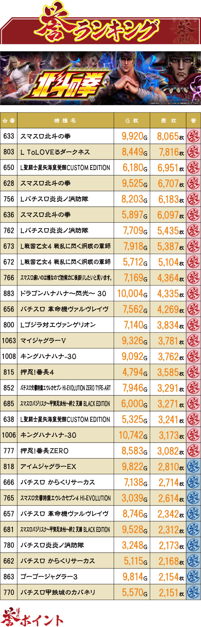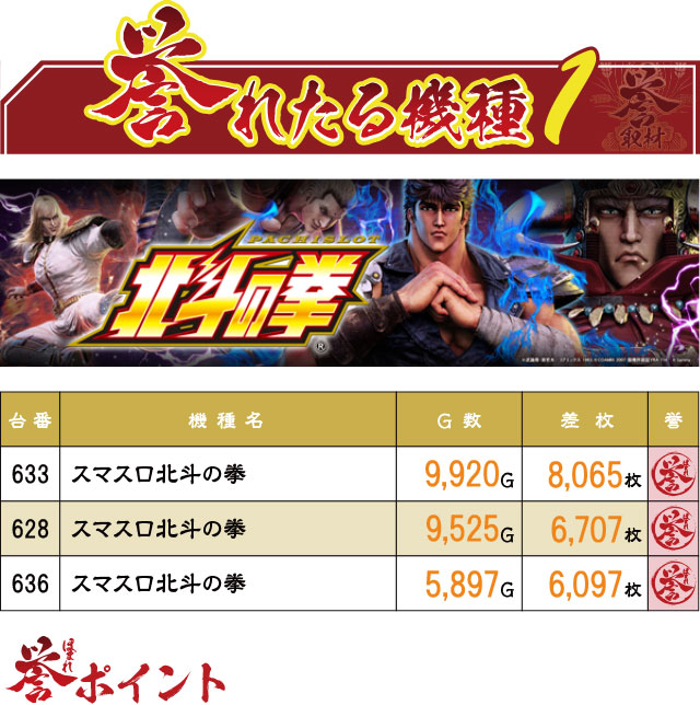 この日の首位レコードを勝ち取ったのは『スマスロ北斗の拳』の633番台。+8,000枚を超える記録だった。またこの日の『北斗』からは、さらに2台の+6,000枚レコードが誕生している。注目は、ハイスペックAT機に混じり、『ジャグラー』シリーズ&『ハナハナ』シリーズが複数台ランクインしていたこと!