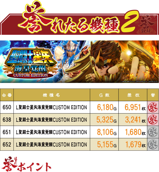 4台設置の『L聖闘士星矢海皇覚醒CUSTOM EDITION』は、4台ともに誉マーク!内2台が赤誉マークだった。これはもう全台系と思って間違いない…!?