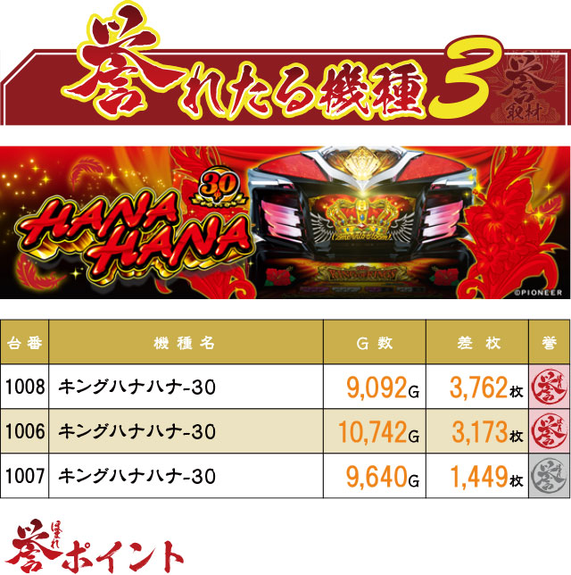 『ハナハナ』シリーズの勢いが溢れていたこの日。シリーズの中で頭1つ飛び出す活躍を見せていた『キングハナハナ-30』からは赤誉マークが出現!ハナハナファンをたっぷり楽しませてくれた。