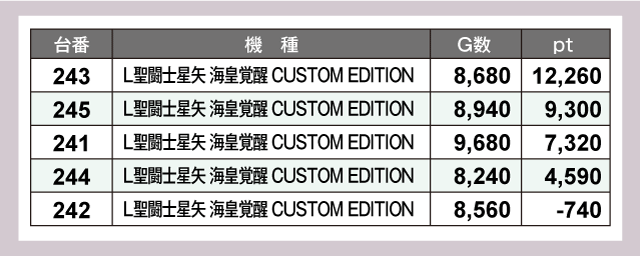 特に目を引いたのが『L聖闘士星矢 海皇覚醒 CUSTOM EDITION』だ。243番台は唯一の万枚オーバーを達成するほか、245番台は+9,300ptと、スロットコーナーの盛り上がりをけん引していた。
