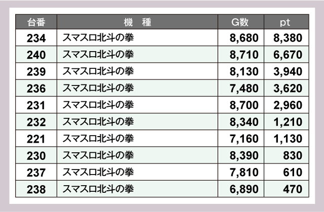 『スマスロ北斗の拳』においては、234番台+8,380ptや240番台+6,670ptなど機種性能を上手く引き出す台が複数見られ、多くのファンを楽しませていた。