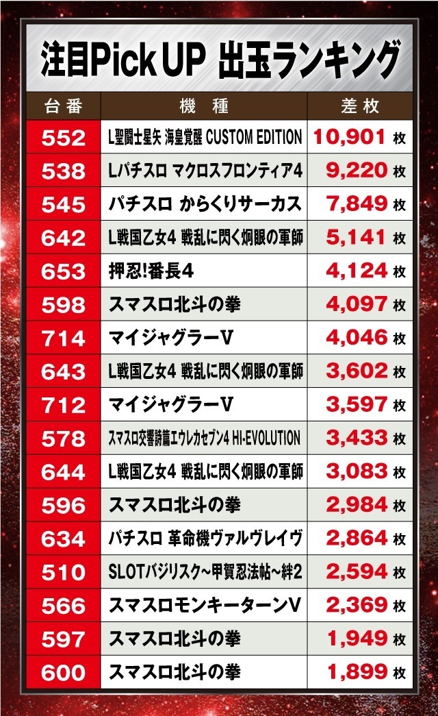 また、その他の機種においても好調な台が多数確認でき、なかでも『L戦国乙女4 戦乱に閃く炯眼の軍師』が+5,141枚に+3,602枚、またAタイプながらも奮闘したのが『マイジャグラーⅤ』で、2台が+3,000枚超という見事な結果を残している。