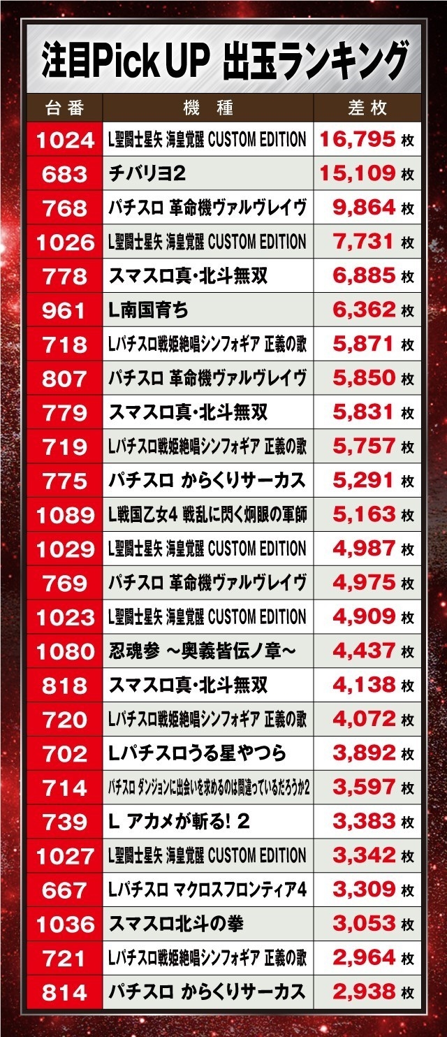 この日、出玉ランキング1、2位にランクインしたのは『L聖闘士星矢 海皇覚醒 CUSTOM EDITION』と『チバリヨ2』の2機種で、ともに+15,000枚超という圧巻の結果を叩き出しているだけにファンも大満足の一日となっただろう。