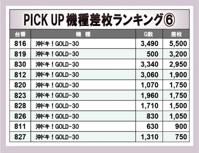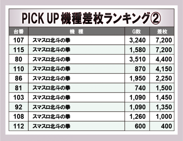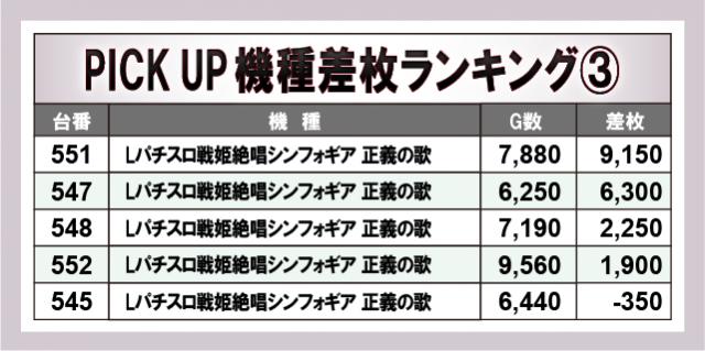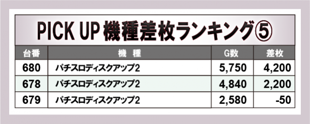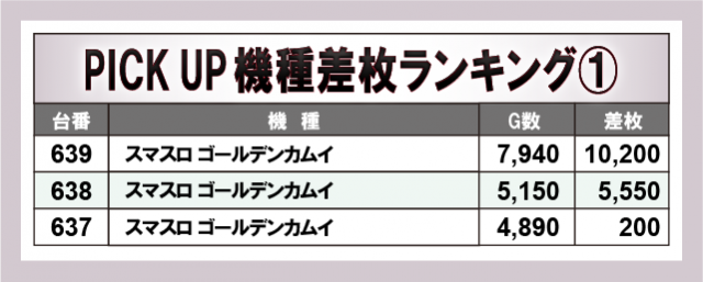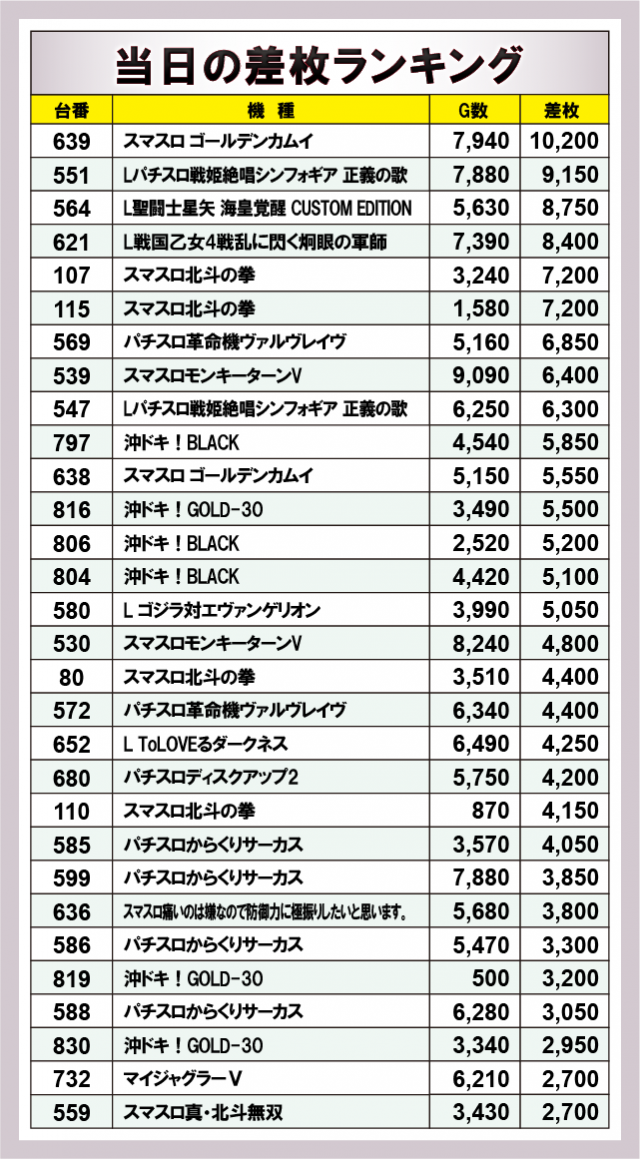 上表の7機種は打ちごたえのある状況が整っており、館内の盛り上がりに大きく貢献していたと言える。いずれも、差枚数プラス4桁を多数輩出していることから、多種多様に幅広い機種でチャンスが隠されていた可能性が高そうだ。