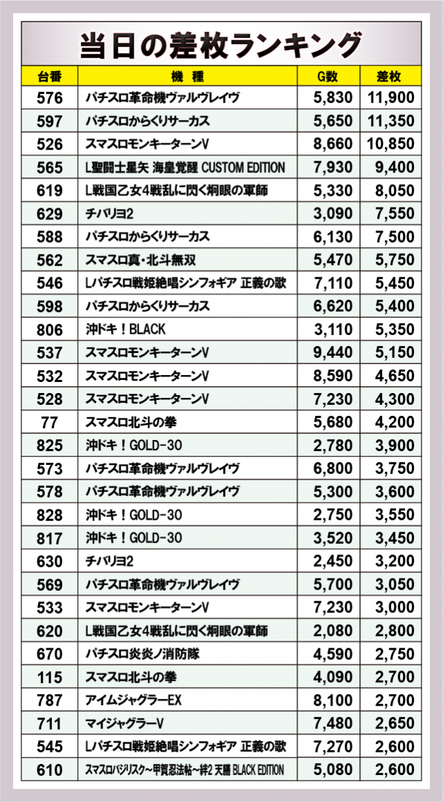 ※差枚数順に掲載しています。