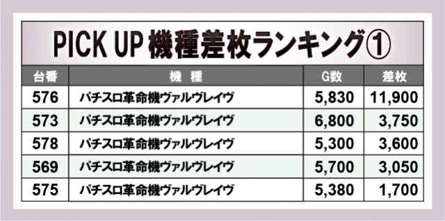 『パチスロ革命機ヴァルヴレイヴ』『チバリヨ2』と人気AT機の活躍が目立っていたのが鮮烈である。また一方で『ジャグラー』シリーズも負けておらず、『ゴーゴージャグラー3』は+2,000枚OVER台が4台発生。その回転数から読み取れるように、やはりファンが相当な好感触を得ていたのは確かだ。