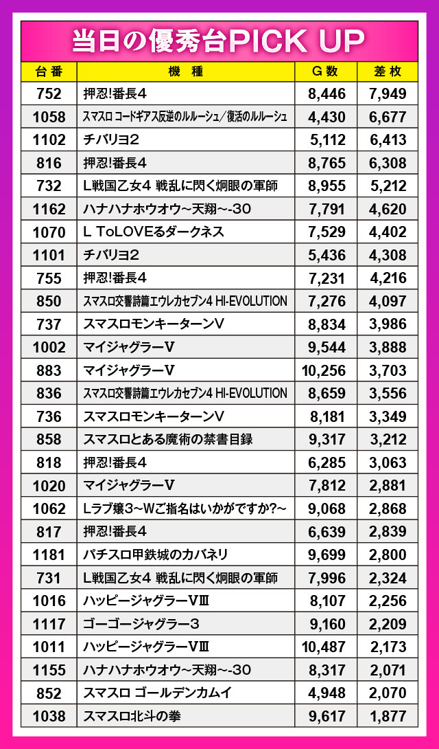 前回パチスロ総合ランキングの3・4位にランクインした『押忍!番長4』が首位の座に。ただし前回の首位記録が+12,400枚だったため、個としてのパワーダウンは否めない。それでも+3,000枚超え台数は前回の1.5倍以上となっており、全体的なベースはパワーアップしていたようである。