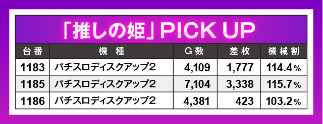 3台設置の『パチスロディスクアップ2』は3台ともがプラス差枚!7,000G以上回された1185番台が最も差枚結果が優秀で、4,000Gちょいしか回されなかった残り2台ももっと回されていたら+3,000枚超えを狙えていたかも。前回は2機種が全台系っぽい動きを見せていたが、今回は『パチスロディスクアップ2』が全台系…!?