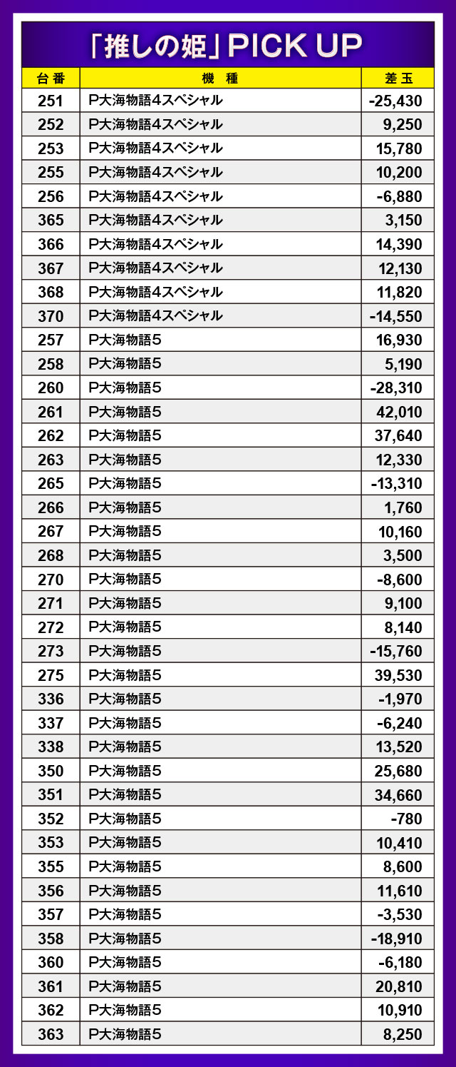 前回6月6日に続き、今回は7月7日というハードル激高の日に推しの姫取材を敢行。盛り上がって当然、と言われる7月7日だが、それはショポい差玉・差枚結果では失望されることを意味している。今回パチスロコーナーでは10,000枚オーバー台こそ生まれなかったが、その分、+3,000枚を上回った台が多く、期待以上の結果に。またパチンココーナーでも『大海』シリーズ2機種から大量のプラス台が生まれていた…!