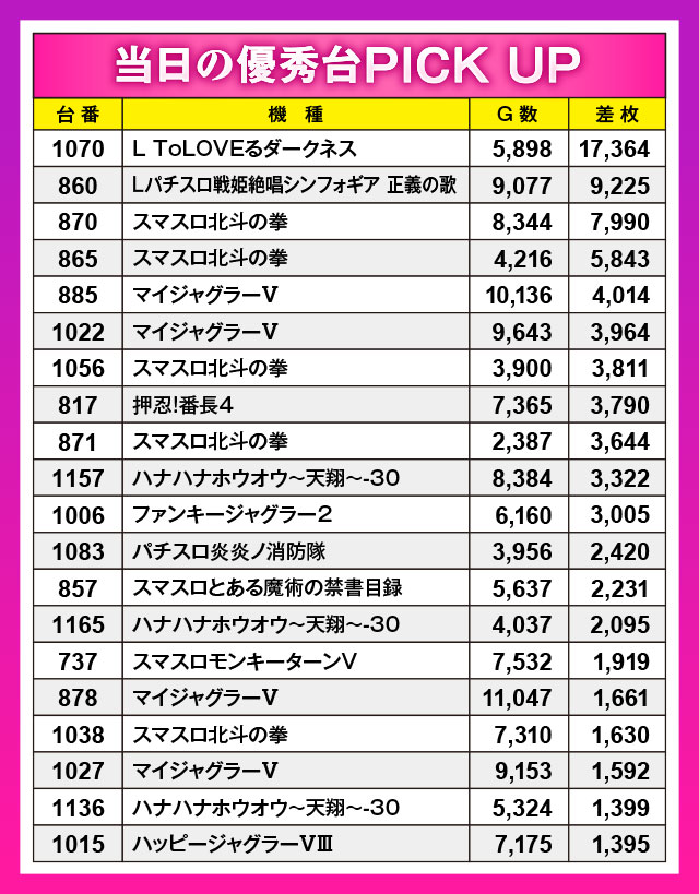 2位に倍近い大差をつけて圧倒的独走で首位の座に立ったのは、『L ToLOVEるダークネス』。その記録、実に17,364枚というとんでもないものだった。2位には新台の『Lパチスロ戦姫絶唱シンフォギア 正義の歌』が9,000枚超えレコードでランクイン。なおTOP20ランキングには、『スマスロ北斗の拳』と『マイジャグラーⅤ』がそれぞれ5台と4台のランクインを果たしていた。この2機種には優秀台が多かった…!?