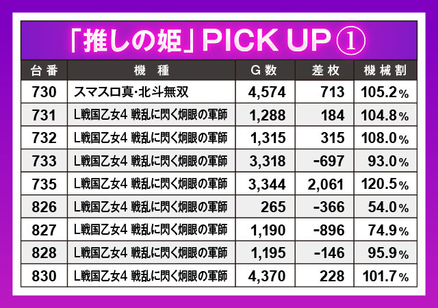 『スマスロ真・北斗無双』の730番台から5台並びでプラス台連発、さらに『L戦国乙女4 戦乱に閃く炯眼の軍師』826番台から4台並んで怪しい動きあり。前者は大きなプラスはないが、マイナス台は1台のみ。後者はプラマイ0レベルの差枚結果ばかり。両方ともに優秀台並びだったのかもしれない。