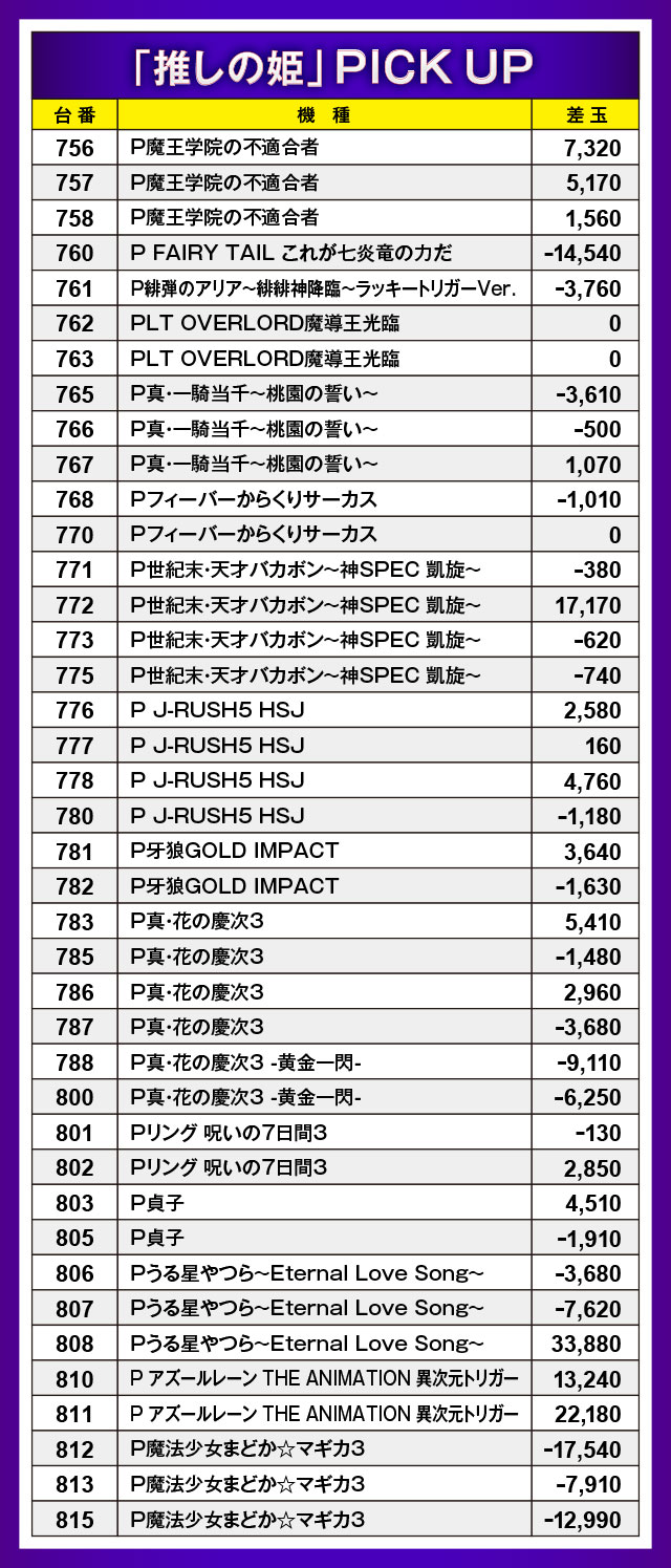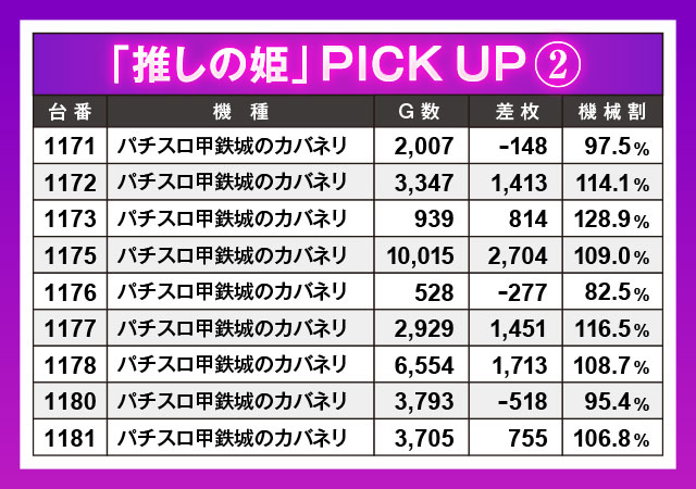全台系疑惑が巻き起こっていたのは、9台設置の『パチスロ甲鉄城のカバネリ』。9台中マイナスは3台のみ、さらに3台ともマイナス値はわずかなものだった。大きなプラス差枚もなかったが、安定して7割近い勝率を生み出せたのは、やはり全台系だったからだろうか。