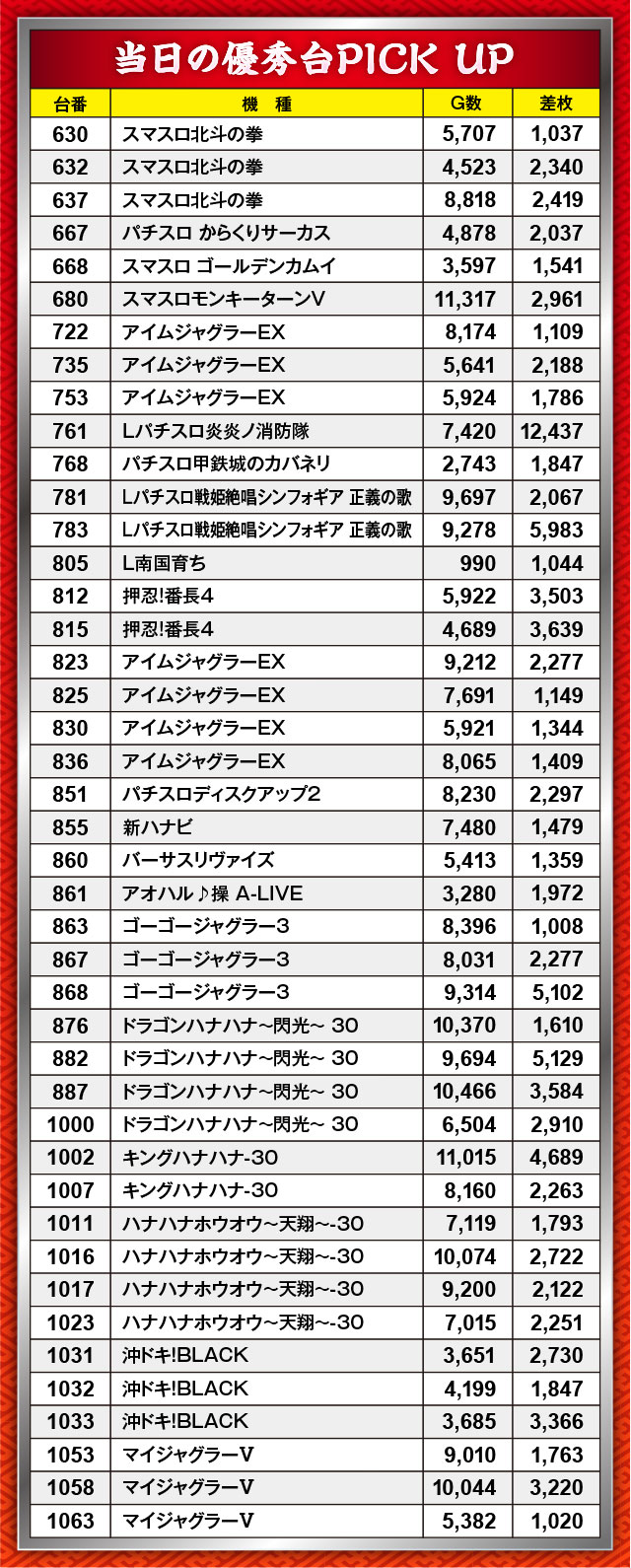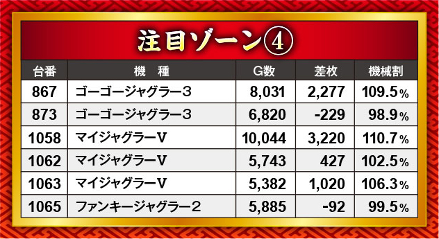 この日も数多くのプラス台が誕生。その中で最も高い差枚結果を残したのは、『Lパチスロ炎炎ノ消防隊』761番台。この日唯一の10,000枚オーバー台として、パチスロコーナーの頂点に君臨することとなった。またこれまでと同じく、『ジャグラー』シリーズと沖スロから大量のプラス結果がお目見え!