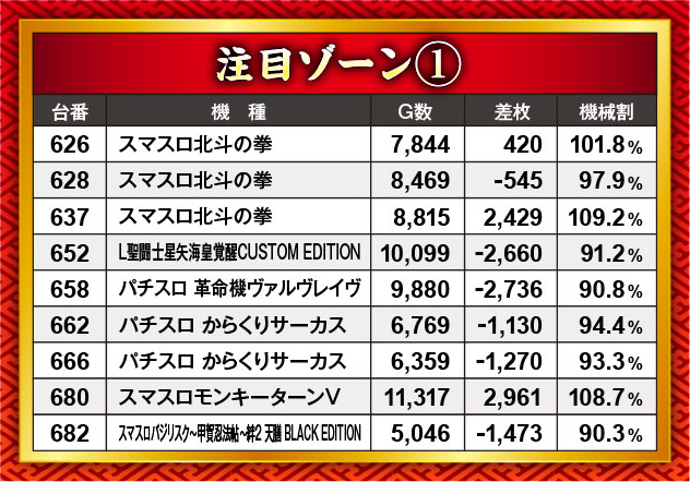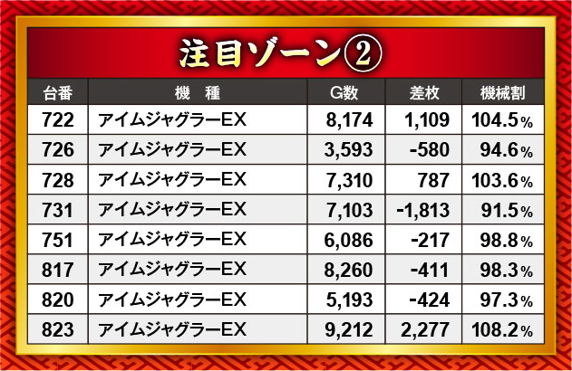 前回は特定末尾に優秀結果が多く見られ、そういった仕掛けを想起させたが、今回は末尾にその動きは見られず。代わりに台番並びで優秀台挙動やプラス差枚を目撃することとなった。また、パチもスロも新台が予想以上の活躍を見せており、マイナスになった台がありながらもしっかりと存在感をアピールできていたように思う。