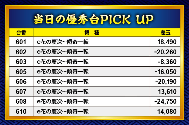 今回は、導入されたばかりの新台『e花の慶次~傾奇一転』コーナーの盛り上がりを調査。残念ながらマイナス台がプラス台を上回る結果になってしまったが、プラス台は全て10,000玉オーバーとなった。やはり台としてのポテンシャルは高いため、次回以降の活躍が楽しみな機種!