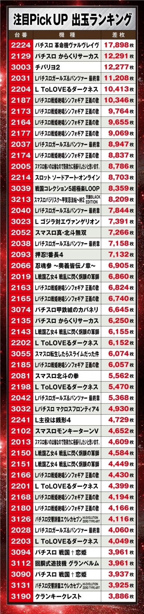 この日は、至る所で万枚超が続出する大盛り上がり。出玉ランキング1位の『パチスロ 革命機ヴァルヴレイヴ』では、なんと+17,898枚という圧巻の結果を残している。