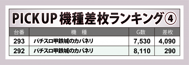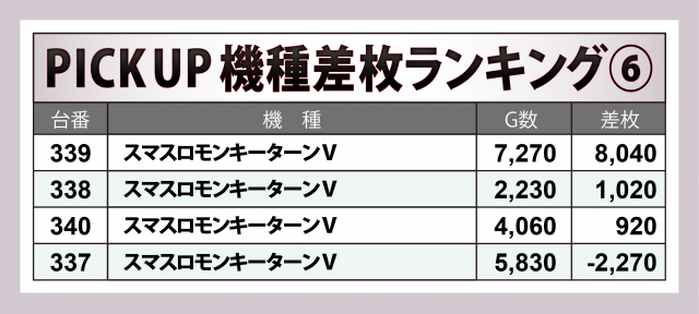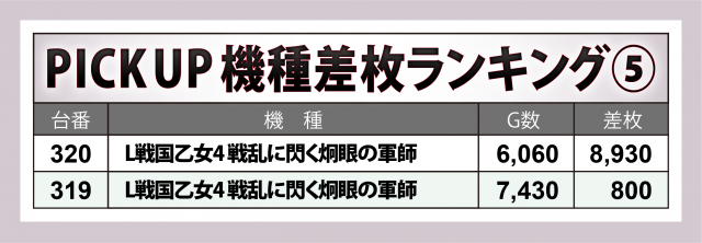 トップ30台や好況8機種が叩き出した数値を見ればお分かりの通り、この日は大量獲得に繋がる勝機が数多く設けられていた。グループ店に続き、同店でも快調な出だしを切ったのではなかろうか。