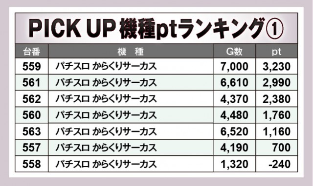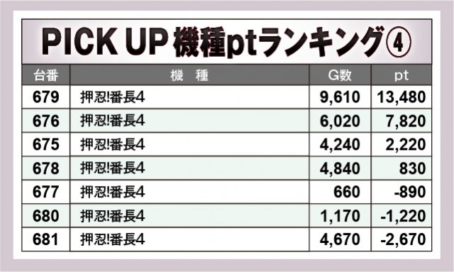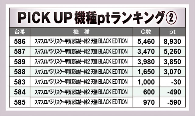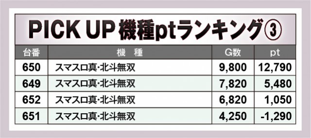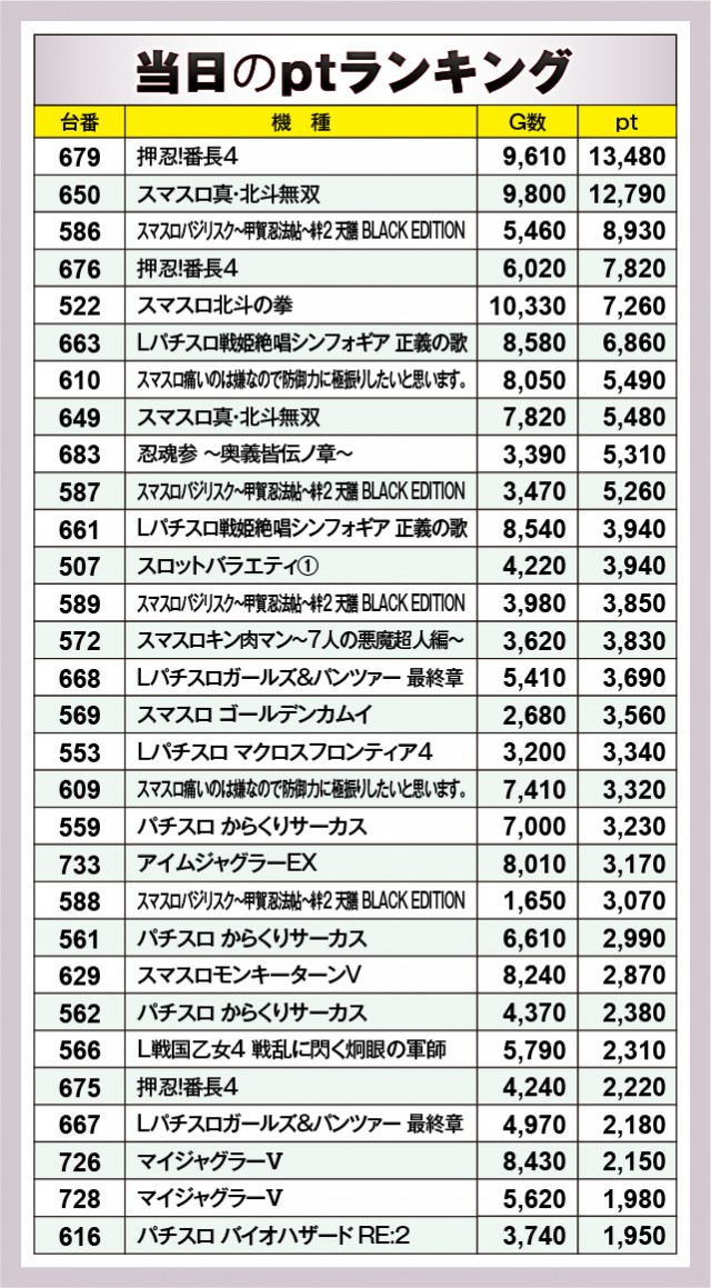 上表の4機種はいずれも高い活気と熱気を放っており、店内の盛り上がりに一躍買った存在と言えるだろう。特に『スマスロ真・北斗無双』650番台と『押忍!番長4』679番台は万pt OVERを記録しており、圧倒的な輝きを放っていたのが印象的だ。『スマスロバジリスク~甲賀忍法帖~絆2 天膳 BLACK EDITION』もまとまったptを獲得していたのが鮮烈で、ファンは好感触を得て歓喜していたことだろう。