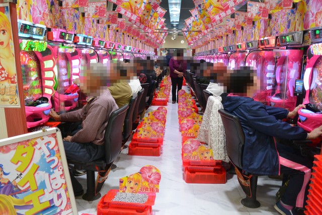 午後の4円パチンココーナーでは、まばゆい程の彩色に包まれた「CRスーパー海物語IN沖縄4マリンシェルビビッドピンクバージョン」が盛況。プレイヤーからの支持も厚く、みな一様に笑顔をのぞかせていた。
