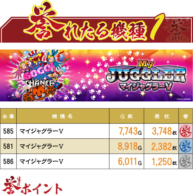 『マイジャグラーⅤ』コーナーの中で、最もGOGOランプを灯らせていたのが585番台。易々と+3,500枚を突破したのは、優秀台の持つポテンシャルが開花したからなのだろうか。