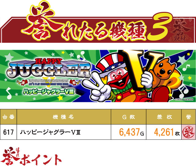 『ハッピージャグラーⅤⅢ』からも+4,000枚超え記録が出現。コンスタントにボーナスを吐き出し、安定した挙動でこの結果を生み出してくれた。