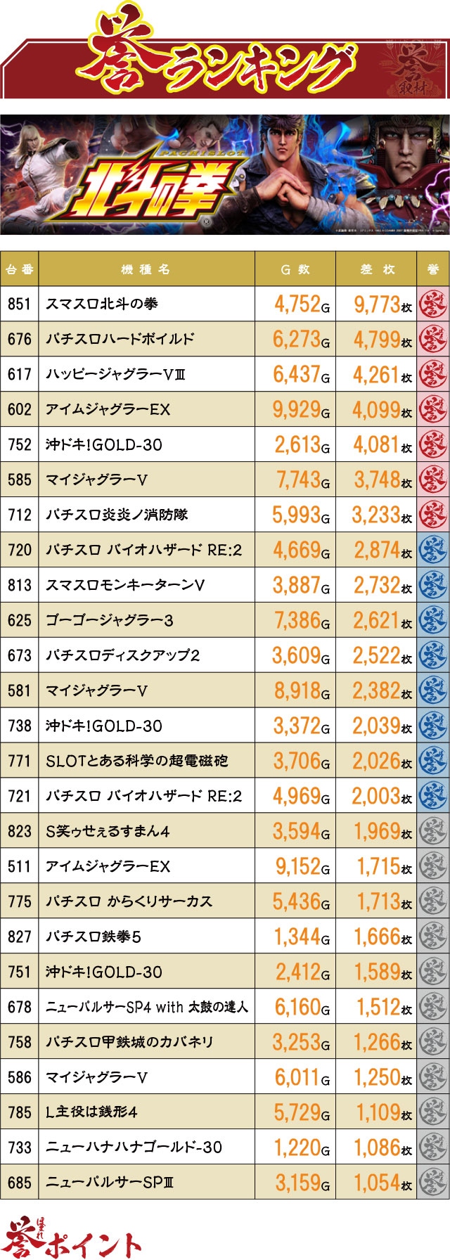 『スマスロ北斗の拳』が1位記録の座に輝いた今回の誉取材。あと少しで10,000枚に迫るこの記録は、2位以下を大きく突き放すほど圧巻のものだった。また『パチスロハードボイルド』『パチスロディスクアップ2』『笑ゥせぇるすまん4』『パチスロ鉄拳5』などの機種がランクインを果たしていたのは興味深い。