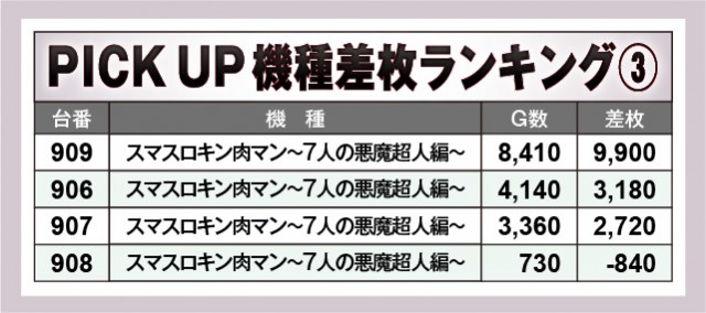『Lパチスロ炎炎ノ消防隊』『新ハナビ』は全台プラス差枚数をマークし、同店の高い実力を実感する内容となっている。また『スマスロキン肉マン~7人の悪魔超人編~』『L戦国乙女4 戦乱に閃く炯眼の軍師』も9割がプラス台で、全体的に高い勝率を記録しているのが鮮烈だ。