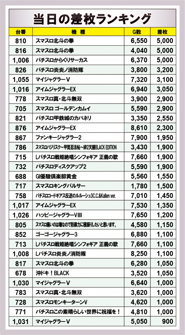 『スマスロ北斗の拳』『パチスロからくりサーカス』から大台突破台が生まれており、店内の盛り上がりに大きく貢献していたと言える。同時に『ジャグラー』シリーズも名を連ね、その存在感をアピールしていたのが鮮烈だ。