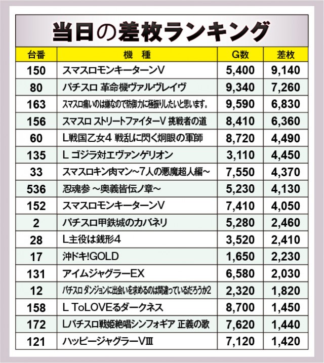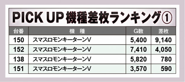 『スマスロモンキーターンV』は全台がプラス差枚数を達成しており、前述したように9,000枚という大きな熱量も見られた。それぞれがしっかりと打ち込まれており、遊技していたファンは満足度の高い1日を過ごせたのではないだろうか。同店としてもしっかりと準備した機種が結果を残し、大いに満足できたはずだ。