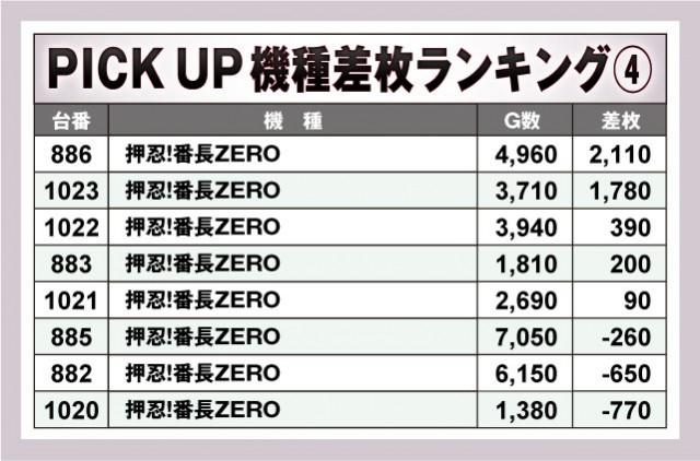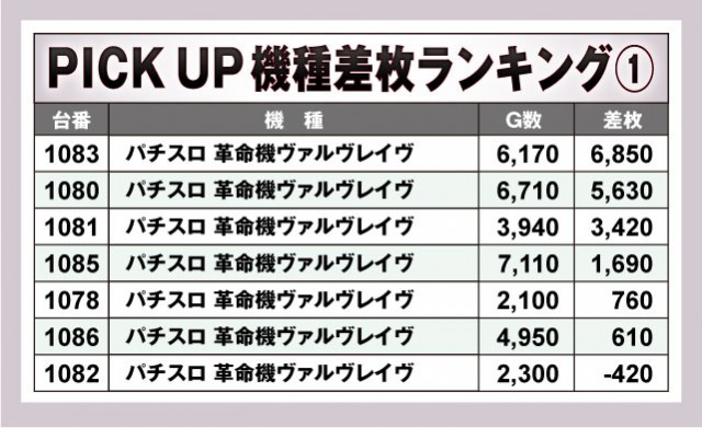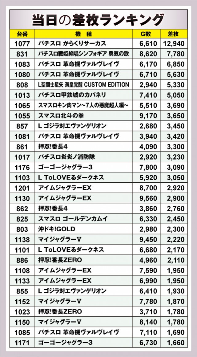 今回の優秀台は上表の通り。まずは『パチスロ からくりサーカス』の1077番台からは万枚オーバー! この日のトップ差枚台となった。