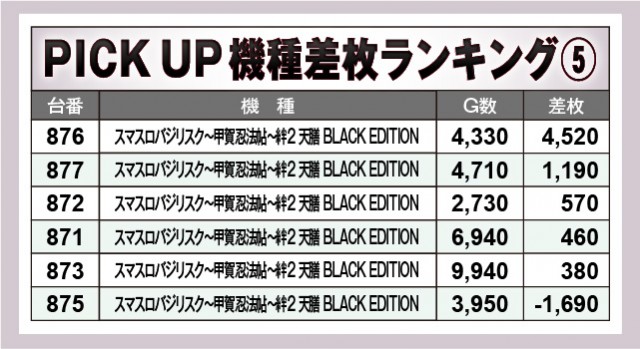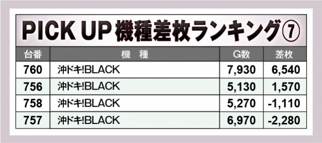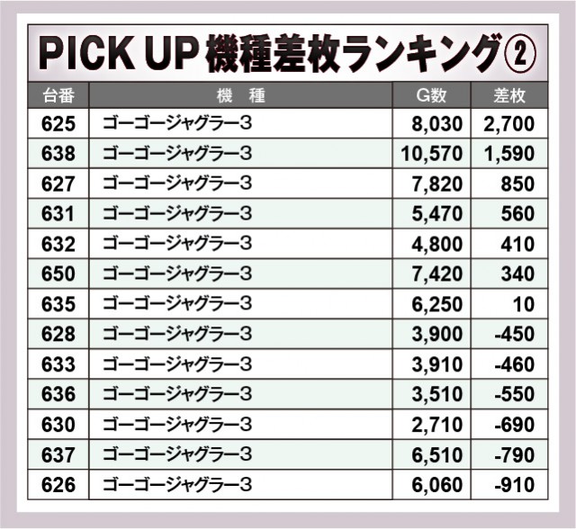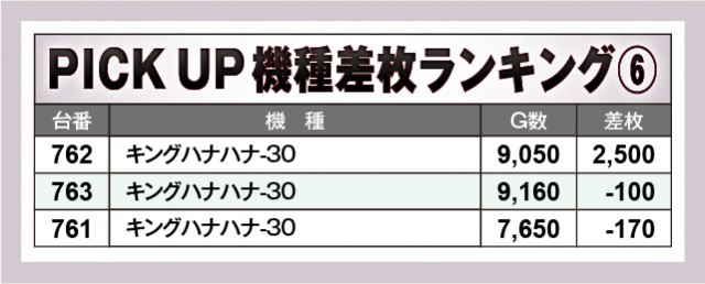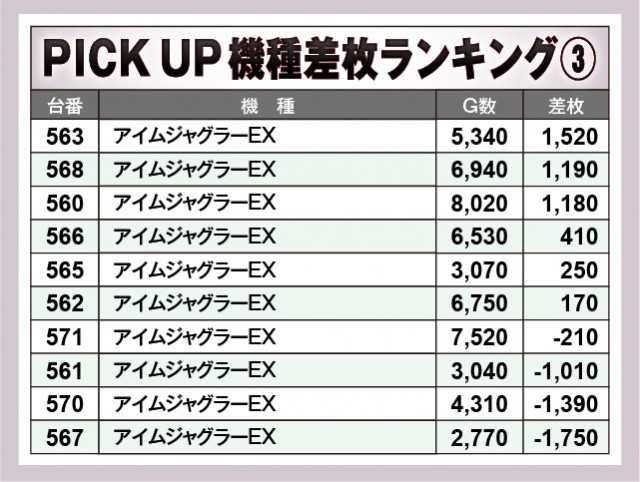 上表の7機種はいずれも高い活気と熱気を放っており、店内を盛り上げる存在となっていた。設置台数が多い『ジャグラー』シリーズは半数以上でプラス差枚が形成されていたため、相当な手応えを感じられたのではないだろうか。全体的に大きなマイナスが見られない点も特筆すべき部分で、同店の意気込みが窺える内容となっている。