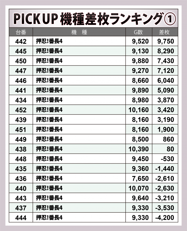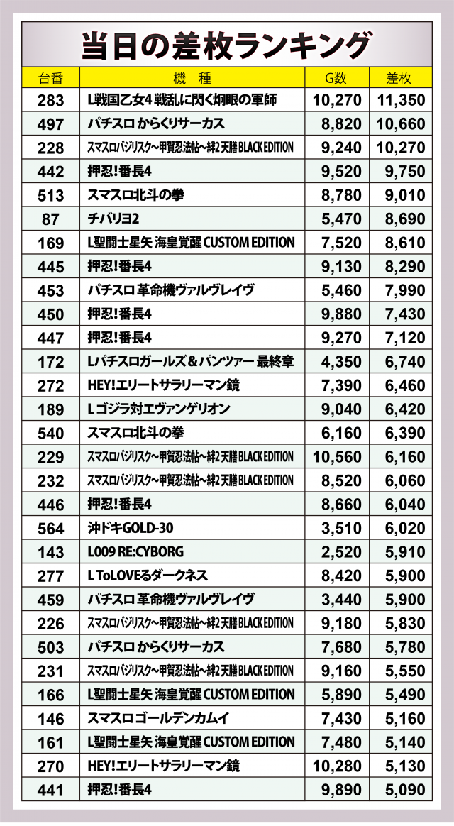 その中では『押忍!番長4』が+9,800枚弱を筆頭に+8,300枚弱・+6,000枚超・+5,100枚弱が1台ずつ&+7,000枚超が2台と、ビッグヒットが連発。