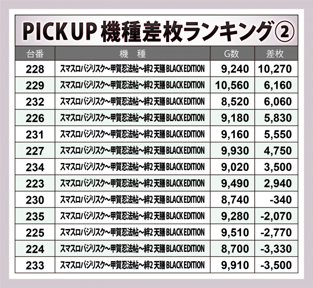 また『スマスロバジリスク~甲賀忍法帖~絆2 天膳 BLACK EDITION』が+10,000枚超の台を代表格に+6,000枚超&+5,000枚超が2台ずつとハイレベルだった他、+5,000枚を超える台も複数カウントすることができた。