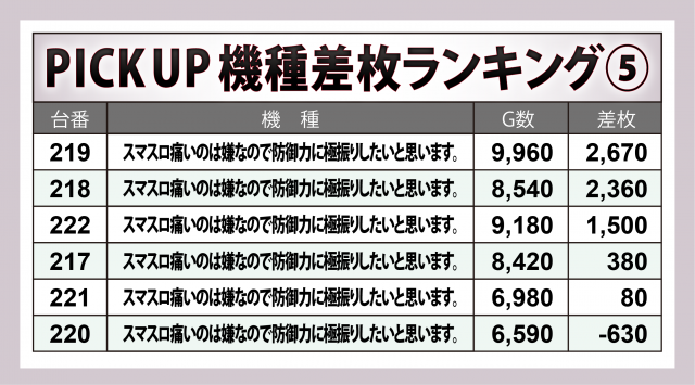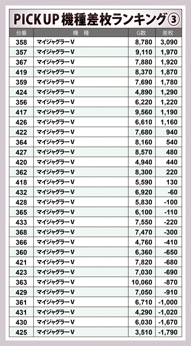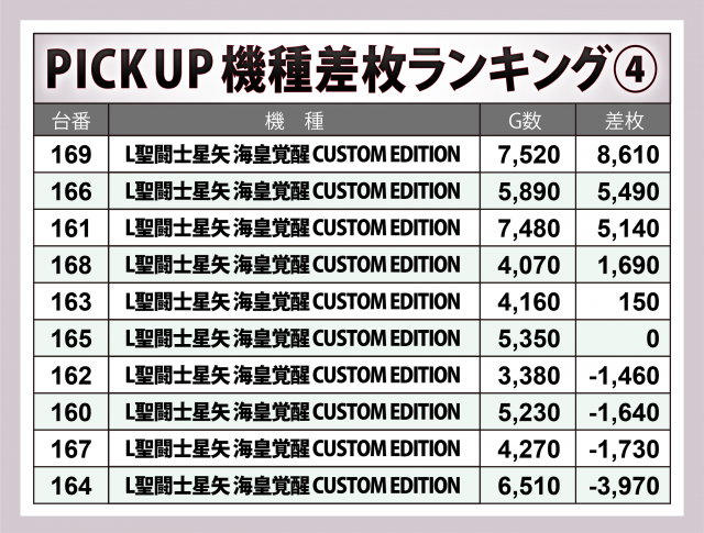 さらに『L聖闘士星矢 海皇覚醒 CUSTOM EDITION』のトップ3も全て+5,000枚を超え、『スマスロ痛いのは嫌なので防御力に極振りしたいと思います。』『マイジャグラーⅤ』といったマシンもキッチリとした差枚数の台を残していた。